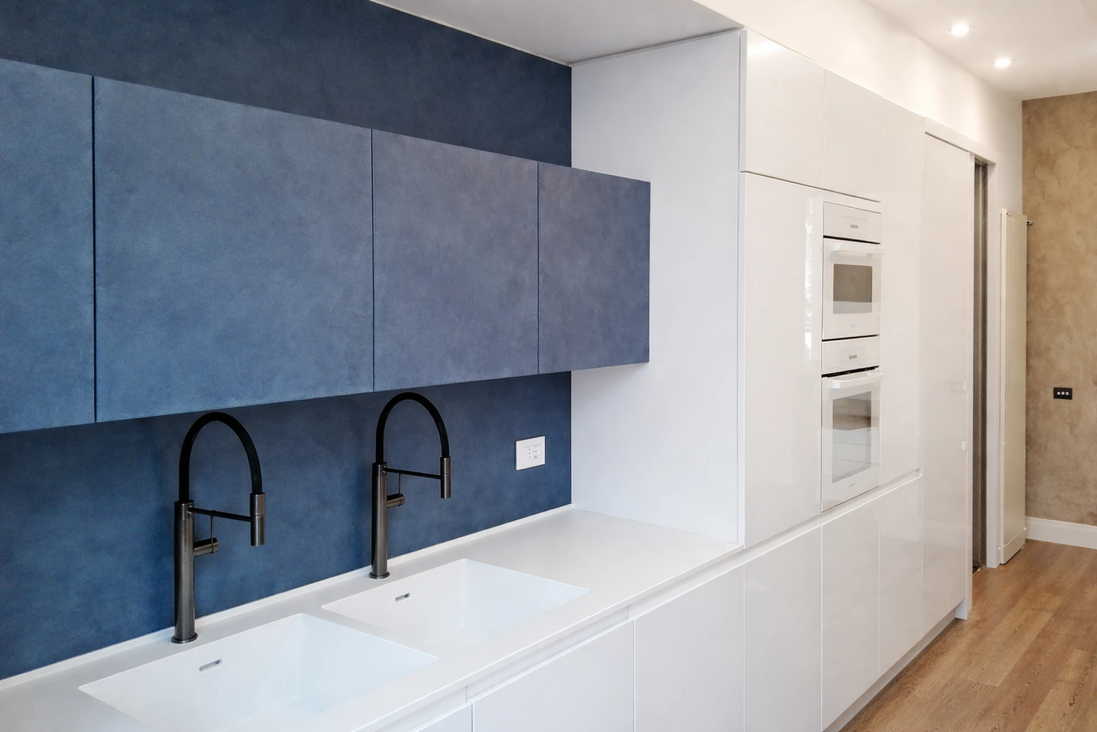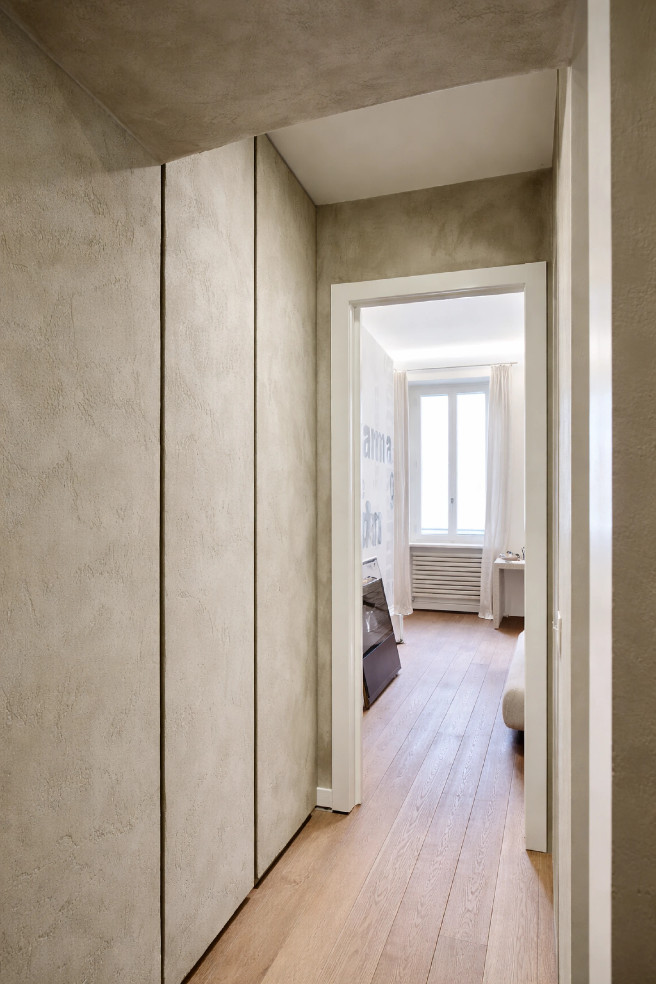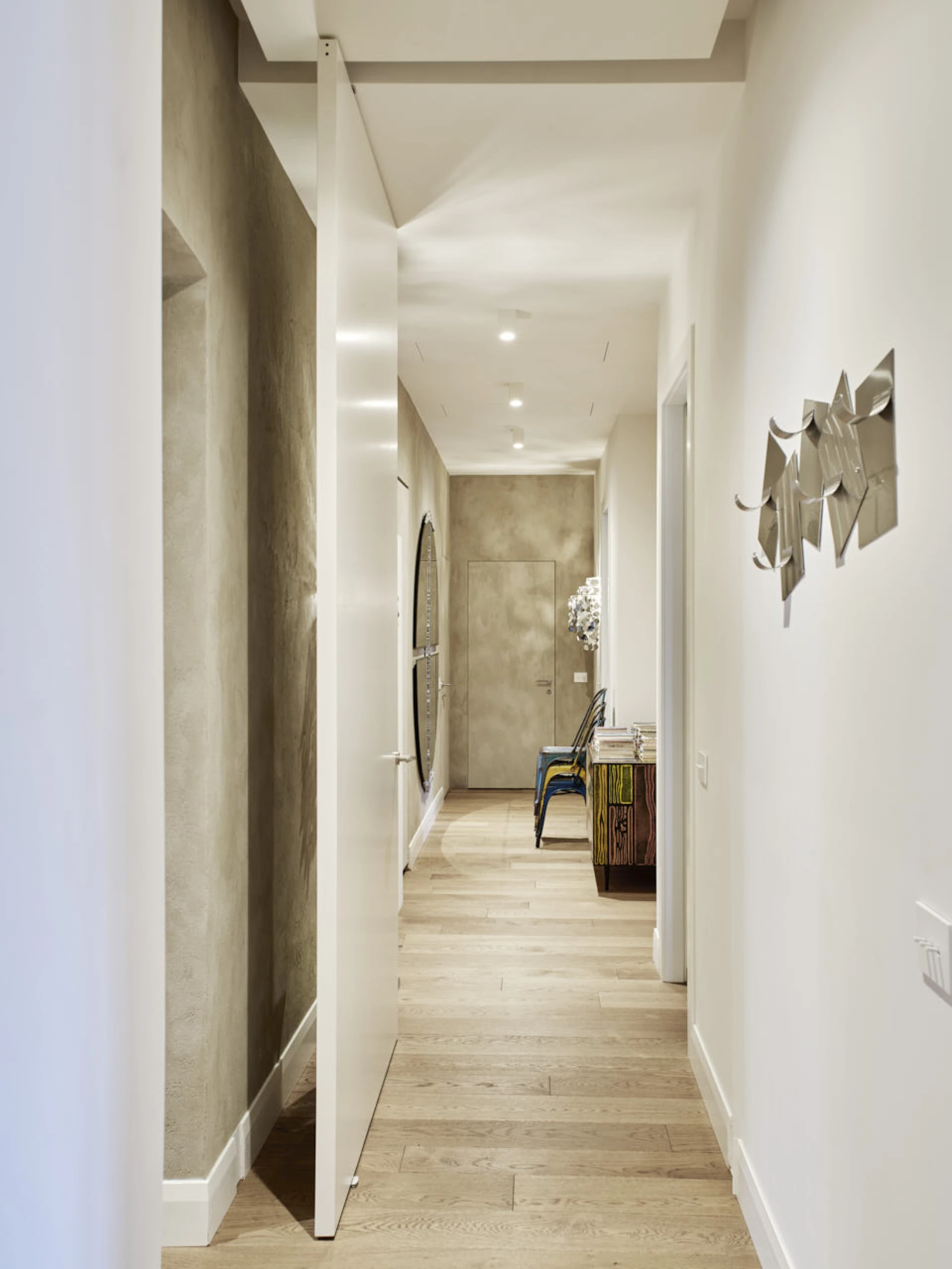 Nel progetto è stata inoltre valorizzata una lunghissima parete centrale dell’appartamento, trasformata in fulcro visivo e materico grazie alla nostra finitura naturale in Argilla e Canapa. La sua presenza continua accompagna lo sguardo lungo lo spazio, scandendo l’architettura con una superficie calda, strutturata e profondamente tattile, capace di assorbire e restituire la luce con vibrazioni uniche. Questa scelta materica non è solo estetica, ma identitaria: rafforza il carattere dell’intero ambiente e ne definisce il ritmo compositivo, creando un polmone centrale all’appartamento, per un comfort abitativo.